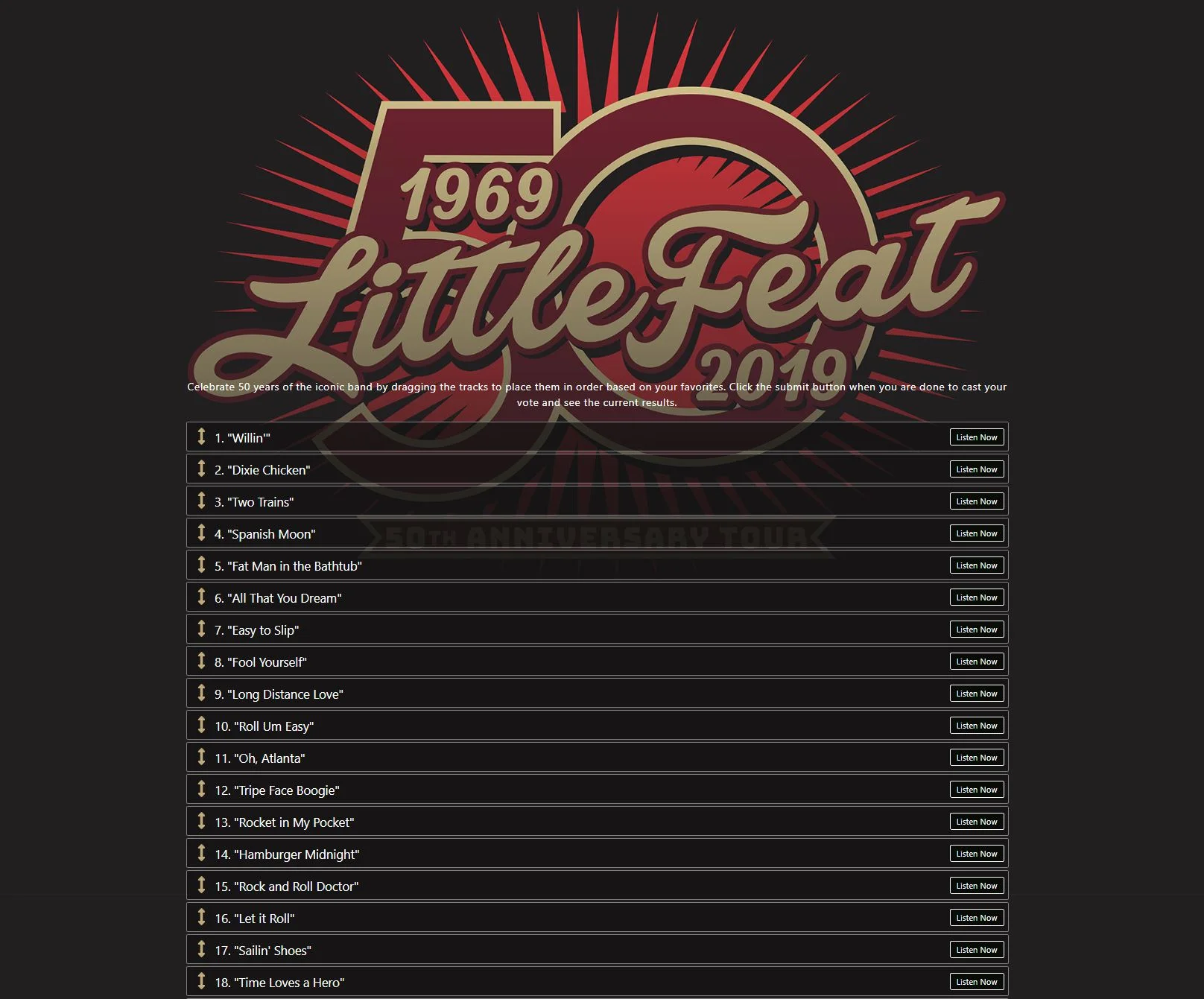 A polling app for legendary band Little Feat. This app, created for super fans, allows users to customize the order of Little Feat’s anniversary album to their liking. Storing the data and listening preferences of 100k fans.